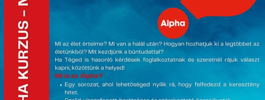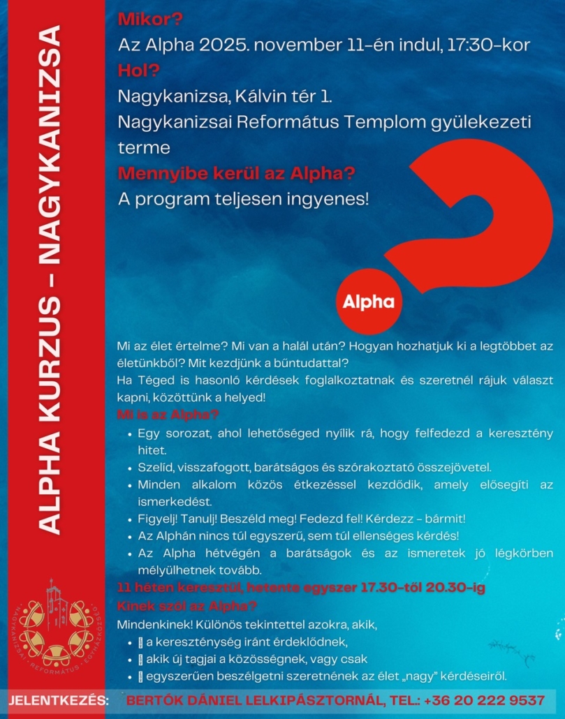 Alpha kurzus indul 2025. november 11-én a Nagykanizsai Református Templom gyülekezeti termében (8800 Nagykanizsa, Kálvin tér 1.)