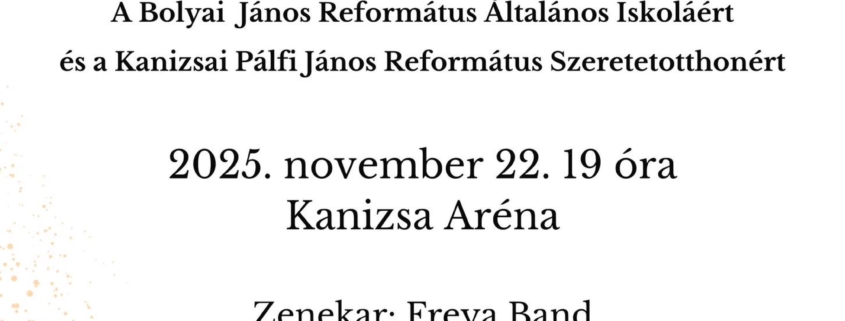 A Nagykanizsai Kiscsillag Református Óvodáért, a Bolyai János Református Általános Iskoláért és a Kanizsai Pálfi János Református Szeretetotthonért 2025. november 22-én, 19 órai kezdéssel Jótékonysági Estet és Bált tart a Nagykanizsai Református Egyházközség.